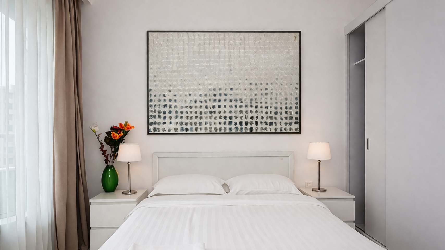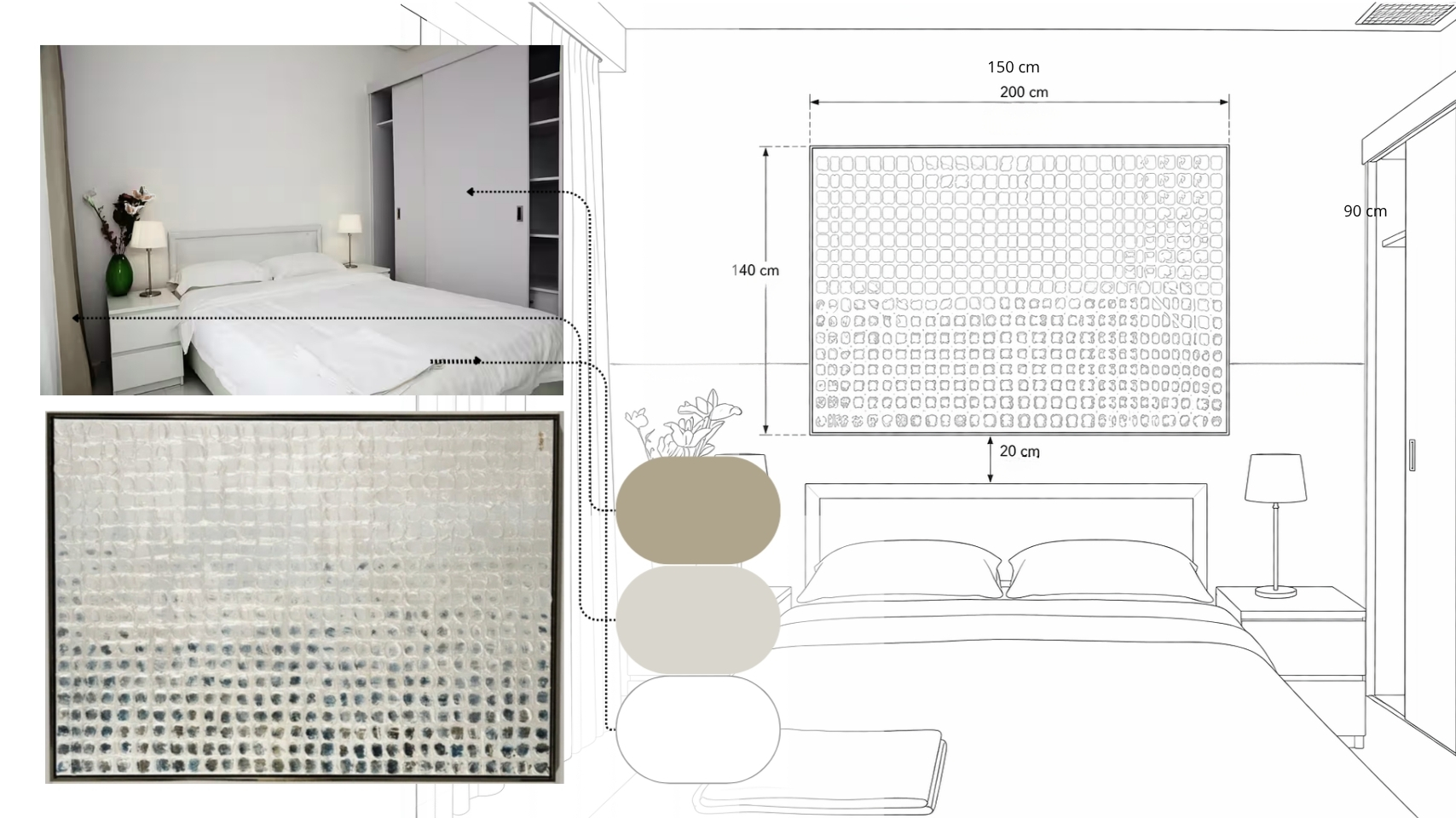 • Dans cet espace nuit, l’intervention artistique vient structurer le mur tête de lit en lui apportant une présence à la fois graphique et lumineuse.