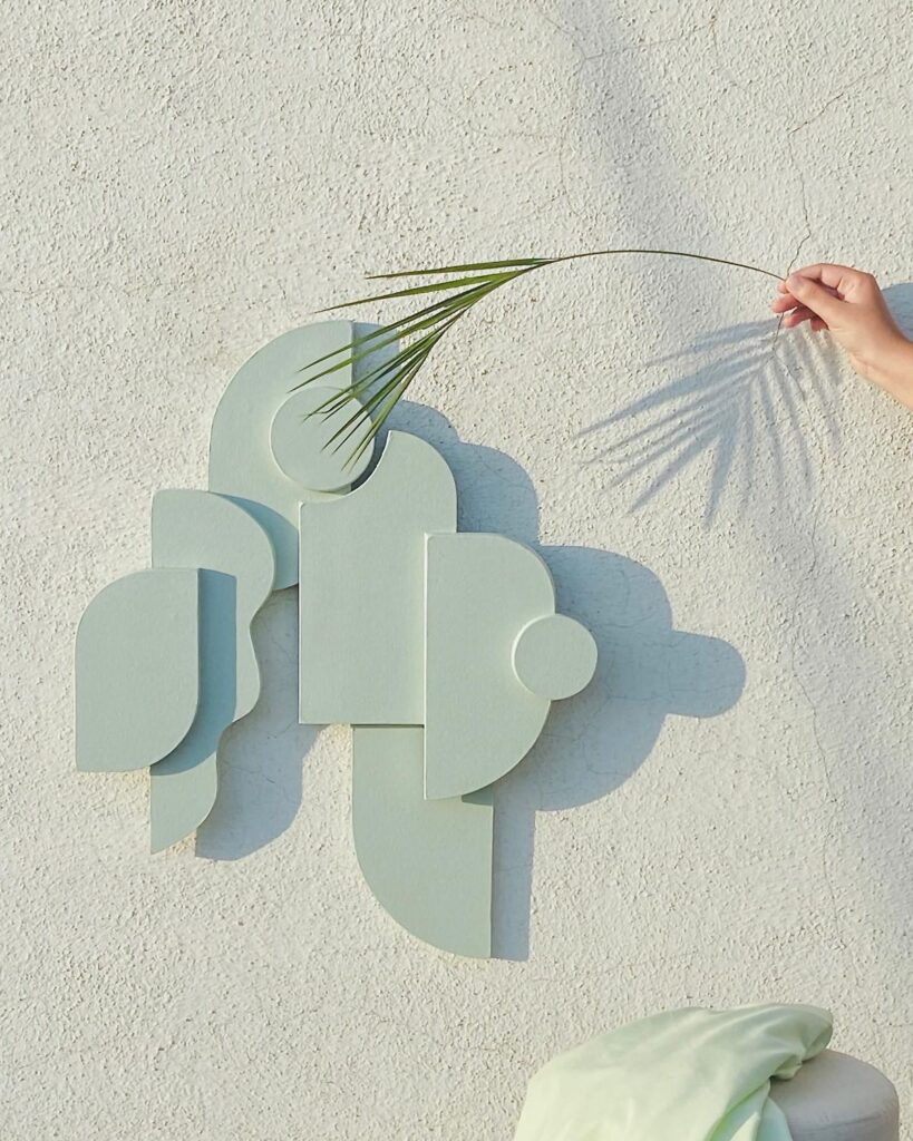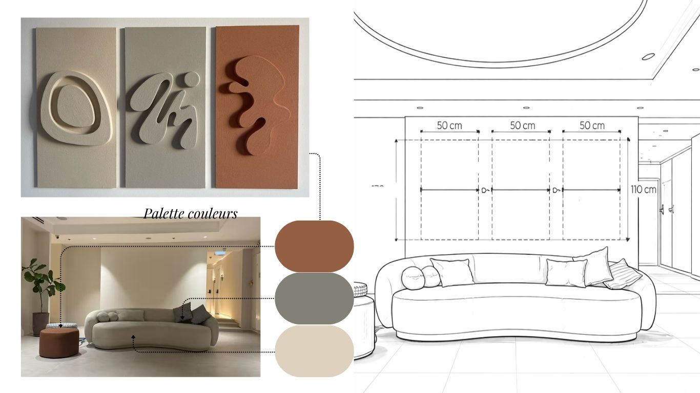 - Une composition murale en relief, pensée dans une palette de tons clairs et minéraux, en continuité avec l’architecture du lieu.