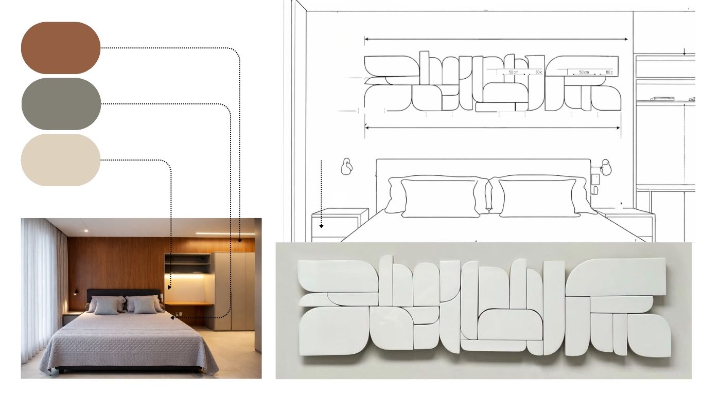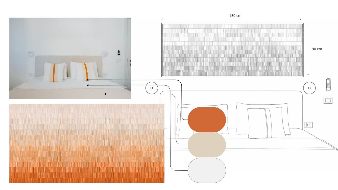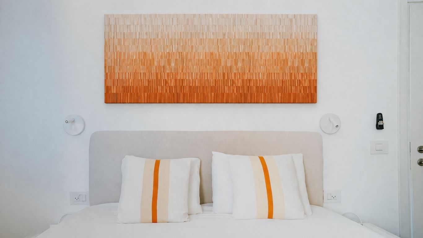 - Dans cet espace nuit, l’intervention artistique vient structurer le mur tête de lit en lui apportant une présence à la fois graphique et lumineuse.