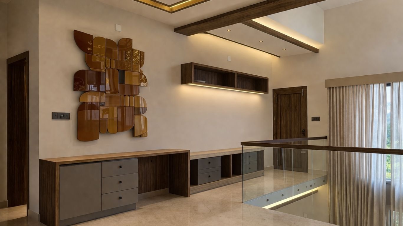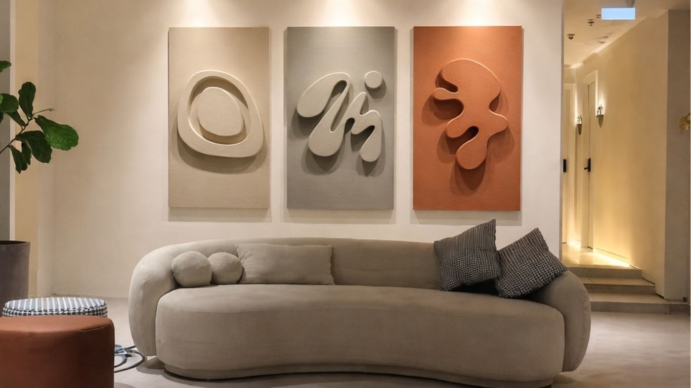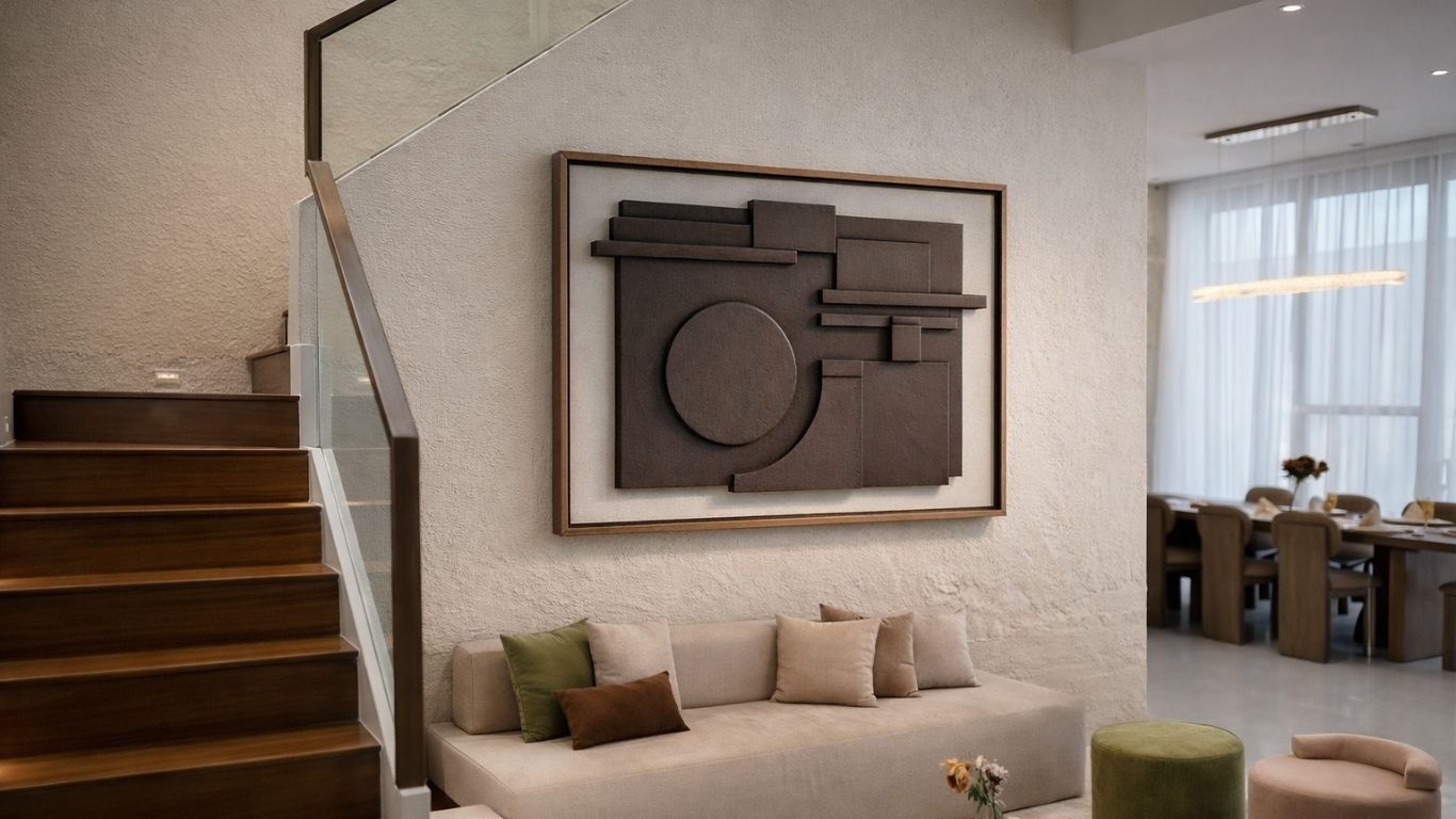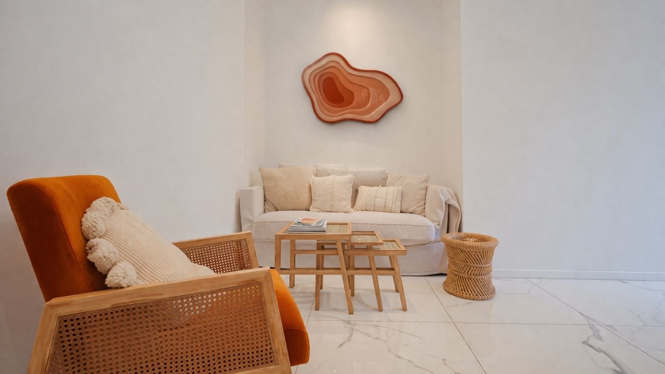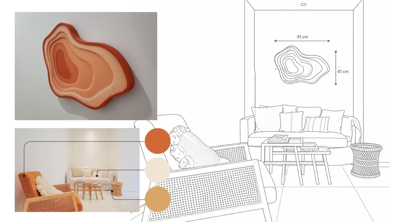 Notre approche a consisté à intégrer l’art comme un véritable prolongement de l’architecture intérieure, en établissant un dialogue précis entre les volumes, la lumière et les matériaux existants. Nous avons ainsi construit une palette chromatique maîtrisée autour de tons chauds — terres, ocres, oranges, et beiges — en continuité avec le mobilier, tout en développant un travail de matière et de relief à travers des œuvres qui introduisent texture et profondeur sans surcharge visuelle. Une attention particulière a été portée aux proportions et au placement, chaque pièce étant dimensionnée et positionnée en relation directe avec les éléments du lieu.
